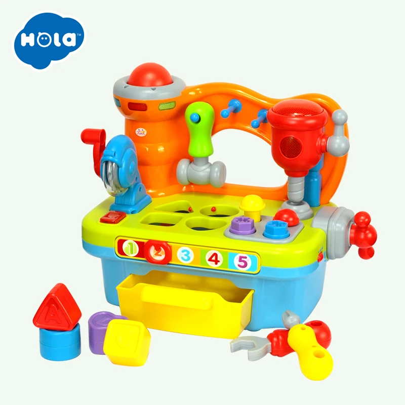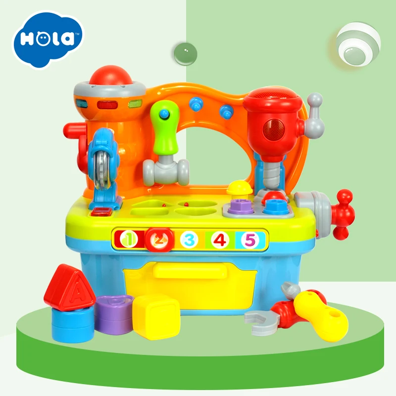 Best Seller HOLA 907 Baby Toys Kids Workbench Pretend Play Tool Set Electric Toy with Music & Light & Blocks To