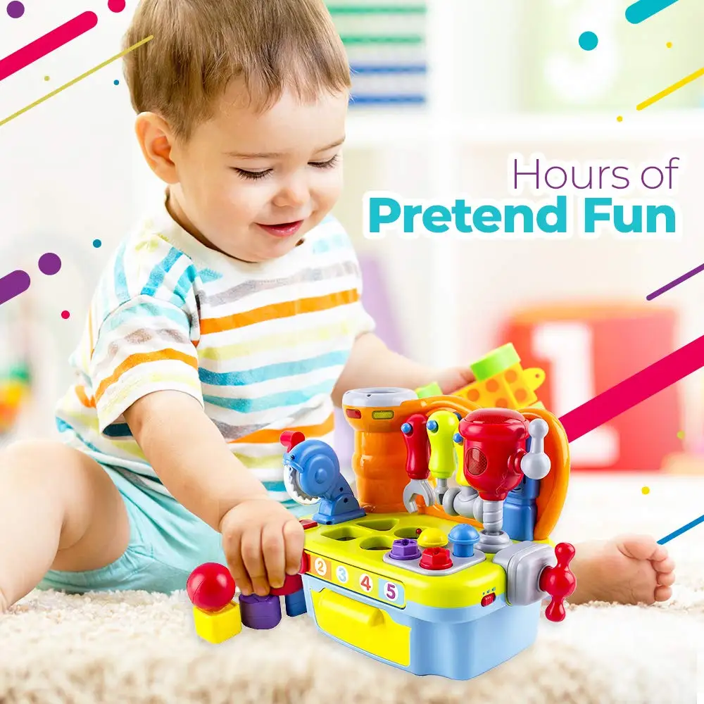 HOLA 907 Baby Toys Kids Workbench Pretend Play Tool Set Electric Toy with Music & Light & Blocks To